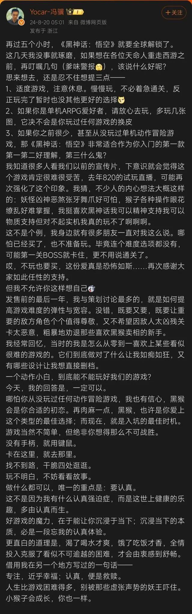 游戏科学创始人、CEO、《黑神话:悟空》制作人冯骥今天凌晨5点在《黑神话:悟空》全球解锁前五小时在微博表示,“如果你是单机ARPG爱好者,请放心去玩,多玩几张图,它决不会是你玩过任何游戏的换皮。”