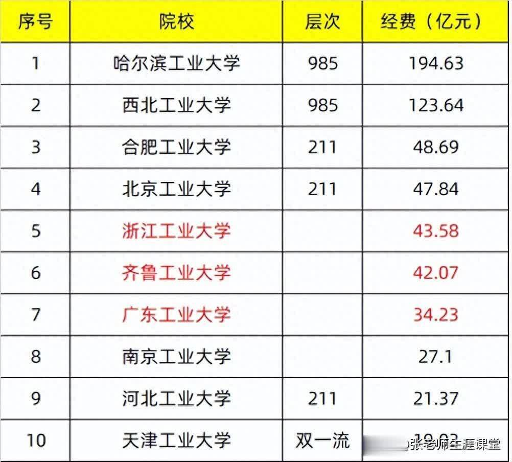 985院校同时也是211院校,而985院校和211院校都属于“双一流”高校。哈尔滨工业大学和西北工业大学排在第一和第二位,浙江工业大学、齐鲁工业大学和广东工业大学这3所“双非”院校的经费也比较高,值得结合自己的分数区间重点关注。