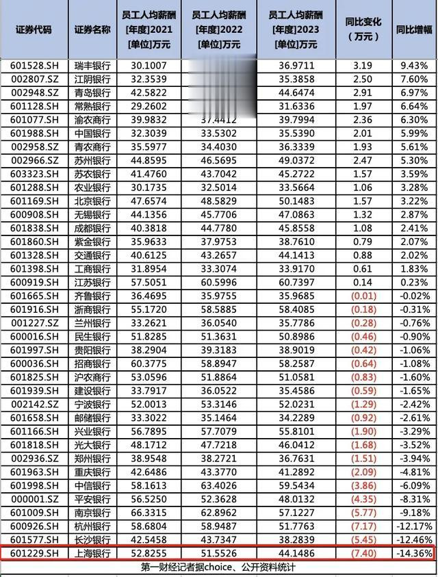 其中,上海银行2023年人均薪酬44.149万元,同比下降7.4万元,降幅“遥遥领先”。