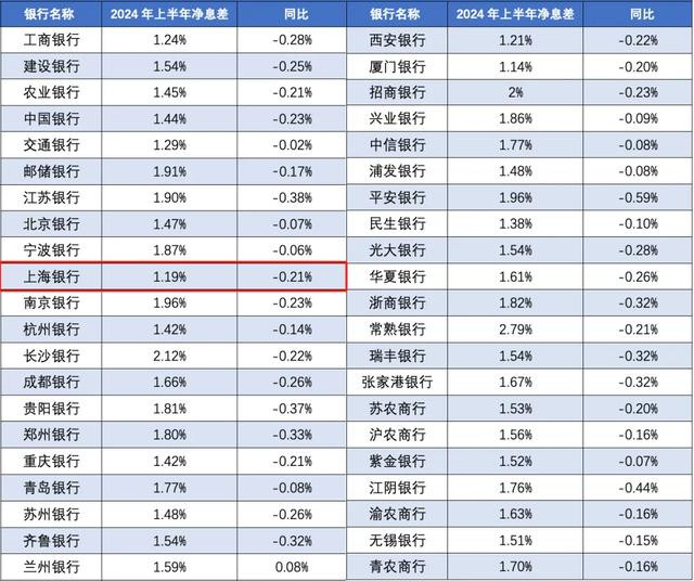 根据尺度商业的梳理,A股42家上市银行中,上海银行2024上半年的净息差排在倒数第二位,仅高于厦门银行的1.14%。